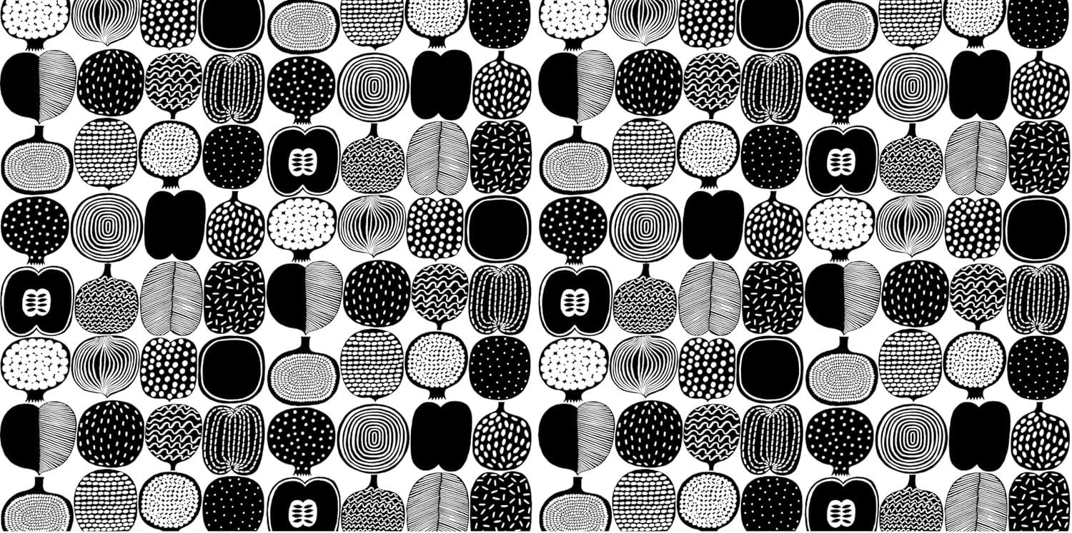 Black and white fruit inspired peel and stick wallpaper by Marimekko