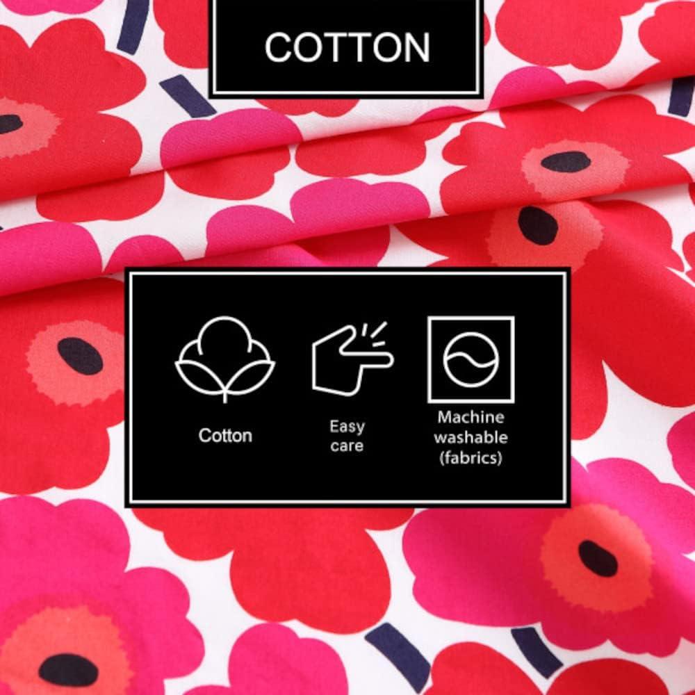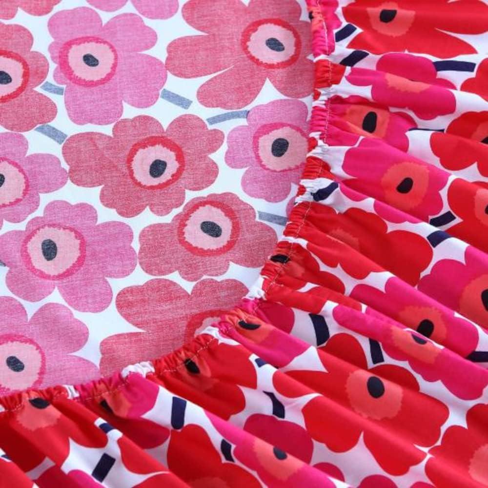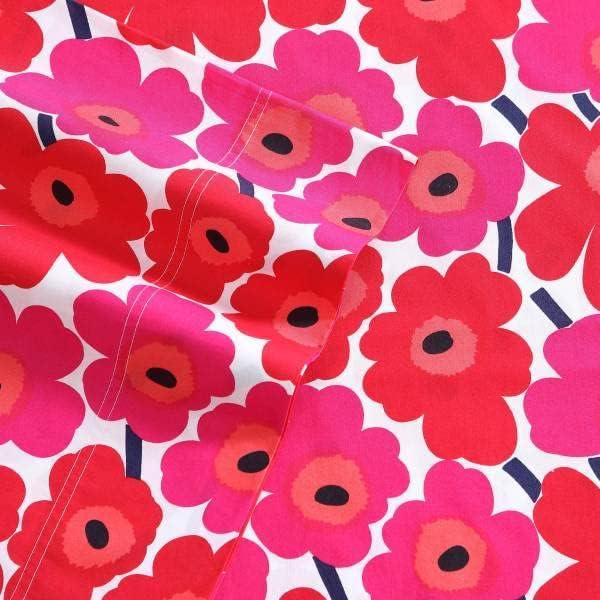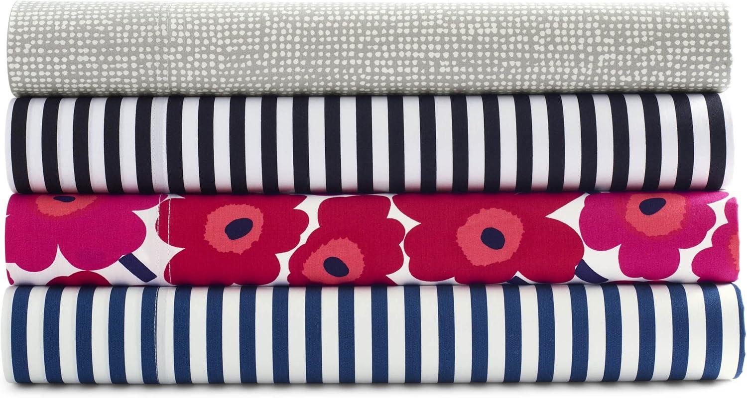 Bring a new style to your bedroom with a sheet set featuring an iconic Marimekko motif. Known for its bold colors and prints, you are sure to find the perfect one to brighten your bedroom. Crisp cotton percale provides a comfortable sleeping surface to lull you to bed. The yarns on a percale sheet are woven in a one-over, one-under pattern, which results in a more durable construction that leaves plenty of room for air to pass in and out. Every sheet will get softer after each wash for lasting comfort. The fully elasticized fitted sheet features premium elastic installed all-around to keep the fitted sheet in place. Fitted sheet fits mattresses up to 18″ for all sizes. Sheet set includes one flat sheet, one fitted sheet, and two pillowcases (one pillowcase in twin size). Ensemble is machine washable for easy care.