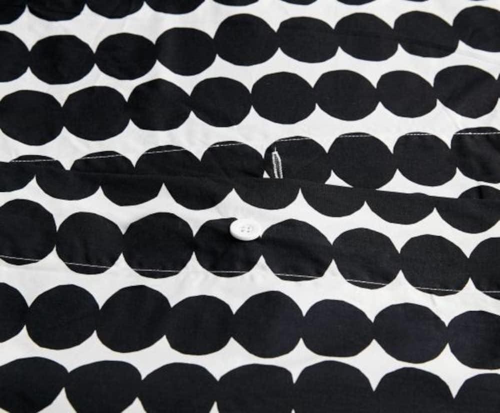 Update your bedding ensemble with a new bedding set from Marimekko. Constucted with ultra soft cotton, the Rasymatto bedding collection features a continuous round circle pattern in a neat bands. This cool modern design celebrates the themes of sustainable living and the enjoyment of working with your hands. Fully reversible, this set is sure to make a bold statement with its black and white color palette. Set is machine washable for easy care. Duvet cover features button closure and additional inner corner ties to secure duvet insert in place during use. Duvet insert is not included.