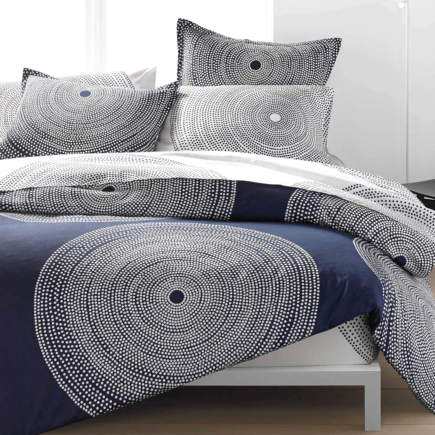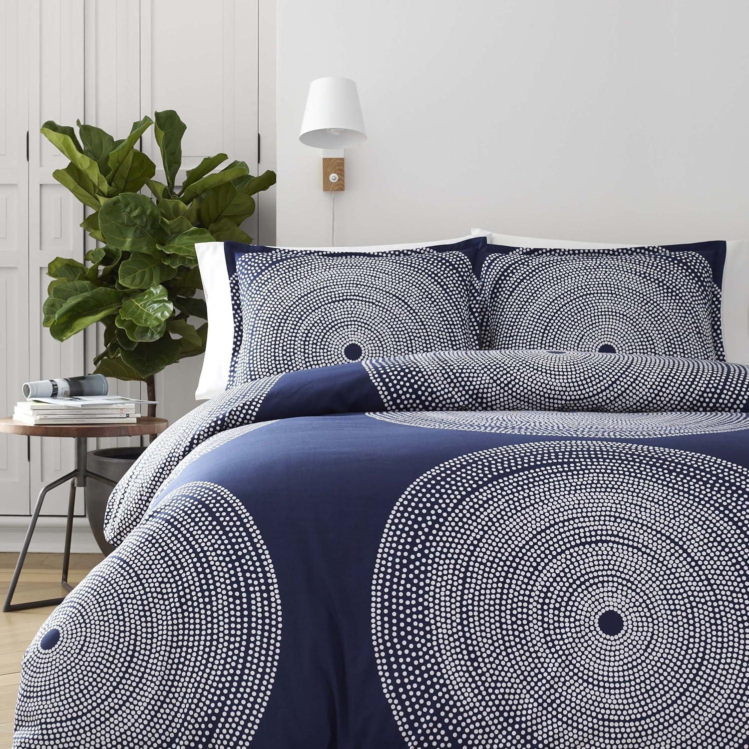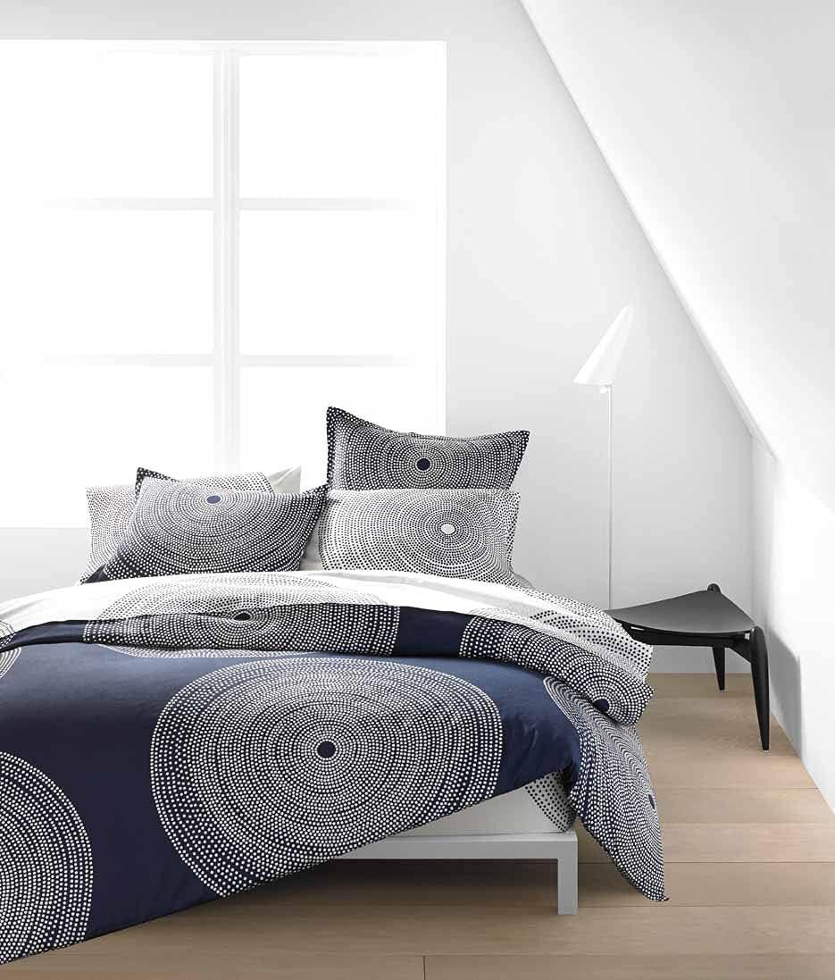 Bring new life to your bedding ensemble with a new duvet cover set from Marimekko. The Fokus Grey duvet cover set features concentric rings of small white dots which join to form larger circles on a medium grey ground, creating a timeless graphic that looks as modern today as it did when it was originally designed in 1999. The engineered placement of the pattern on the duvet cover as well as on the shams forms a pleasing, balanced composition that is bold yet serene in its simplicity. This set is constructed with 100% cotton and the duvet cover features a button closure with additional inner corner ties to secure the duvet in place. Included shams feature an easy overlap closure. Duvet insert is not included. Set is machine washable for easy care.